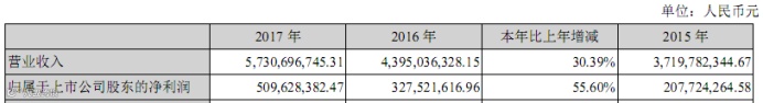 资料显示,华帝股份,前身为华帝燃具有限公司,1992年成立,于2001改制,2004年登陆深交所,主营销售燃气用具、厨房用具、家用电器、自有资产投资、进出口经营。2017年实现营收57.31亿元,同比增长30.39%,归母净利润为5.10亿元, 同比增长55.60% ,居行业增速榜首。