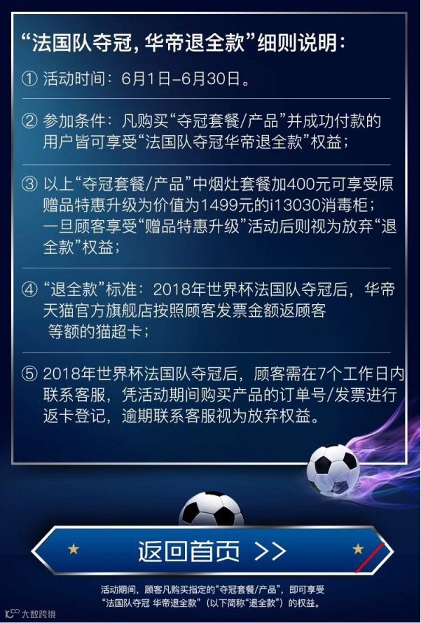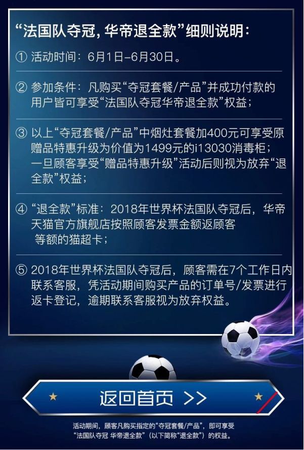 细则显示,整个6月,只要购买指定的厨电套餐,在法国队夺冠以后的7个工作日内,提供购买凭证就能全额提款。