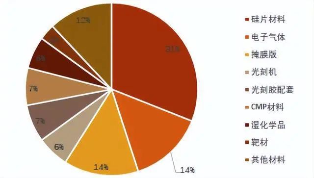 根据北美半导体产业协会(SIA),在各芯片制造材料中,电子气体占比达14%,是仅次于硅片材料之外的第二大半导体材料。硅片材料、电子气体、掩模板、光刻胶、光刻胶配套、CMP材料、湿化学品、靶材、其他材料占比分别为31%、14%、14%、6%、7%、7%、6%、3%、12%。