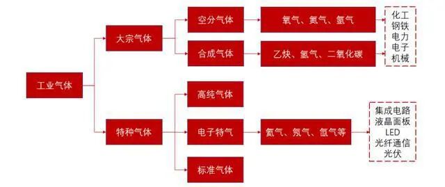 根据制备方式和应用领域的不同,工业气体通常分为大宗气体和特种气体两类。大宗气体包括空分气体和合成气体,这类气体产品的产销量大、对纯度要求相对较低,主要用于化工能源、金属冶炼、机械制造等工业领域。特种气体可分为高纯气体、标准气体和电子特种气体等,品种较多、单一产品用量相对偏小,主要用于半导体、生物医药、航空航天、环境保护等新兴领域。