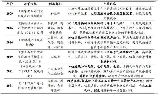 内资企业分头突围,电子特气国产化率有望进一步提升。国内气体公司在资金、技术、设备等方面较国外企业仍有差距,但在技术不断突破、国家政策大力扶持、下游市场发展迅速等多重因素影响下,国内气体企业的竞争力不断增强,市场份额有望扩大。进入十四五以来,各地密集出台政策,重点支持特种气体,尤其是应用于集成电路及新型显示的电子气体的研发及产业化。其中,江苏省、浙江省和广东省的十四五规划中均提到“加快电子气体研发与产业化应用”。在政策的积极支持以及半导体产业的国产化需求下,特种气体将迎来新的发展机遇。