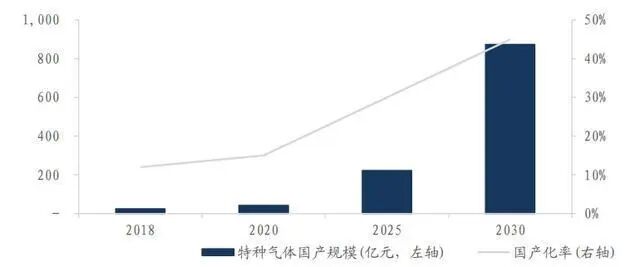 在国产化浪潮带动下我国特种气体市场有望持续扩容,结合2018—2020年我国特气国产 替代节奏以及下游集成电路政策目标增速,机构预测2025年我国特气国产化率有望达30%, 2030年有望达45%。国产化率提升有力撬动我国特种气体生产企业迎来高增,未来三年复合增速达 37%,2025/2030 年国产特气市场规模有望达 220/870亿元。