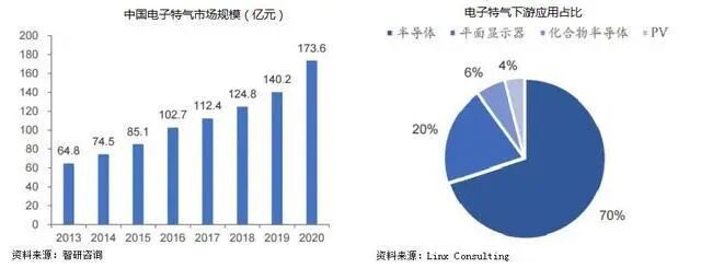 电子特气下游应用广泛,国内市场规模持续扩大。前瞻产业研究院统计数据显示,2013—2020年,中国电子特种气体市场规模从64.8亿元增至173.6亿元,CAGR高达15.12%,未来随着下游晶圆厂的扩产以及半导体材料国产化的推进,预计国内特种气体市场规模仍将维持高速增长。