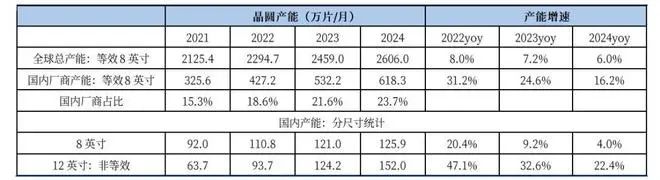 根据全球63家拥有自建晶圆产线的半导体厂商现有产能及扩产情况。预计未来几年,中国大陆晶圆产能将以远超全球增速的态势增长,产能占比将持续提升。机构预计2022—2024年中国厂商晶圆月产能分别为427.2/532.2/618.3万片,同比分别增长31.2%/24.6%/16.2%,2024年国内厂商产能占比将达到23.7%。