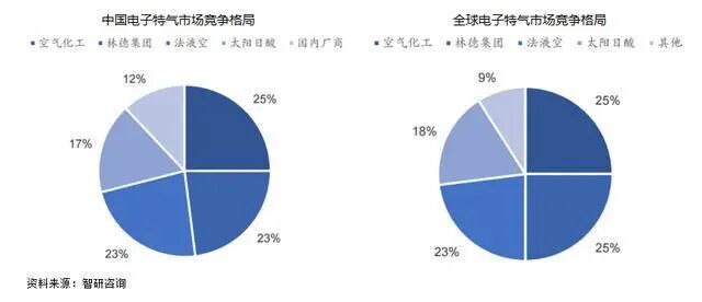 行业竞争格局:海外巨头把持全球市场,电子特气市场集中度极高。目前,全球乃至国内的主要特种气体,尤其是电子特气市场是由海外大型跨国公司占据,本土企业的竞争实力偏弱,国产化需求迫切。目前林德集团、空气化工、液化空气和大阳日酸分别以25%、25%、23%和18%的市场份额垄断全球工业气体市场规模的91%,同时海外四巨头垄断了国内88%的市场份额,国内厂商仅占据12%市场份额。