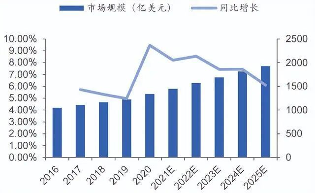 根据中国半导体协会,2020年中国集成电路行业销售额为8848亿元,同比增长17%,近五年年复合增长率GAGR达20%。半导体属电动汽车、数码3C、光伏等成长型行业的核心器件,下游需求持续增长。同时,半导体又是我国被“卡脖子”的战略新兴产业,近两年国内产能大幅扩张,预计未来行业仍有望保持较快增长。