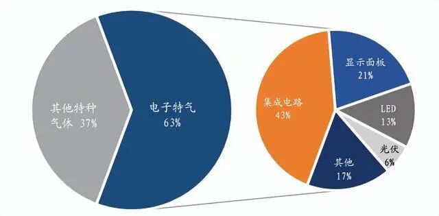 根据亿渡数据统计,2021年在特种气体的细分赛道中,电子特气的市场规模占比达到特种气体市场总规模63%。电子气体被称为集成电路、液晶面板、LED 及光伏等 材料的“粮食”和“源”。在国家政策持续推动以及电子半导体下游需求高速增加的带动下,电子特气市场空间有望进一步扩容。