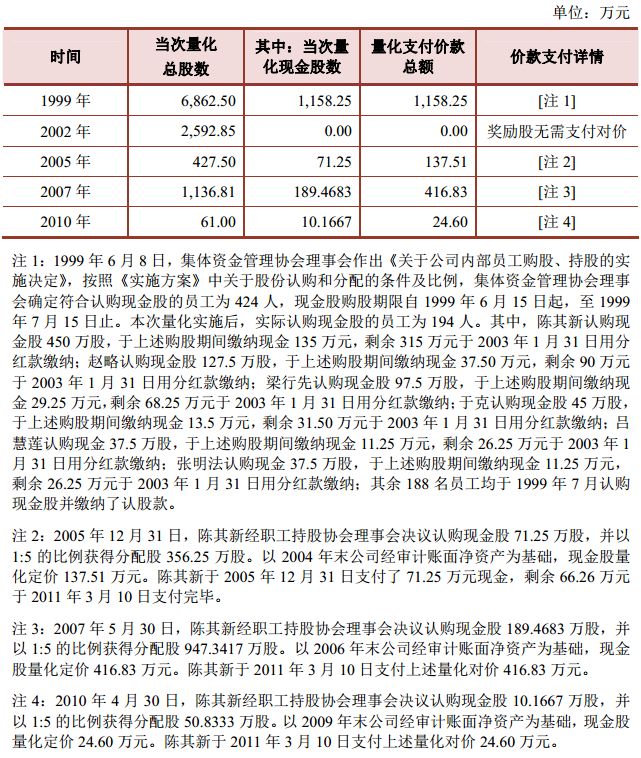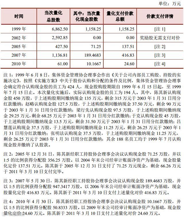 根据上述规定:2005年12月31日,职工持股协会理事会作出的《关于持股会预留股配置的决议》,同意陈其新向持股会认购现金股71.25万股,以2004年末公司经审计账面净资产为基础,定价137.51万元;同时,按照《实施方案》有关配股比例的规定,陈其新以1:5的比例获得分配股356.25万股。2007年5月30日,职工持股协会理事会作出《关于持股会预留股配置的决议》,同意陈其新向持股会认购现金股189.4683万股,以2006年末公司经审计账面净资产为基础,定价416.83万元;同时,按照《实施方案》有关配股比例的规定,陈其新以1:5的比例获得分配股947.3417万股。2010年4月30日,职工持股协会理事会做出《关于持股会预留股配置的决议》,同意陈其新认购现金股10.1667万股,以2009年末公司经审计账面净资产为基础,定价24.60万元;同时,按照《实施方案》有关配股比例的规定,陈其新以1:5的比例获得分配股50.8333万股。陈其新于2011年3月10日支付完毕上述对价。