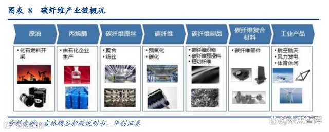 碳纤维产业链包含从上游原油到终端碳纤维成品应用的完整制造过程。首先,从石油、 煤炭、天然气等化石燃料中制得丙烯,并经氨氧化后得到丙烯腈;其次,丙烯腈经聚合 和纺丝后得到聚丙烯腈(PAN)原丝;然后,再经过预氧化、低温和高温碳化后得到聚 丙烯腈基碳纤维;最后,碳纤维与其他材料结合(树脂、陶瓷等),可形成碳纤维复合材 料,并应用于下游各个领域。碳纤维整个生产过程中最核心的环节是原丝制备和碳化。原丝:碳纤维的强度显著地依 赖于原丝的微观形态结构及其致密性,原丝的质量和成本很大程度上决定了碳纤维的质 量和生产成本,而制备原丝的壁垒来自于生产工艺,如聚合、制胶、纺丝等过程。碳化:此环节包含预氧化、低温和高温碳化,氧化炉和碳化炉是关键设备。