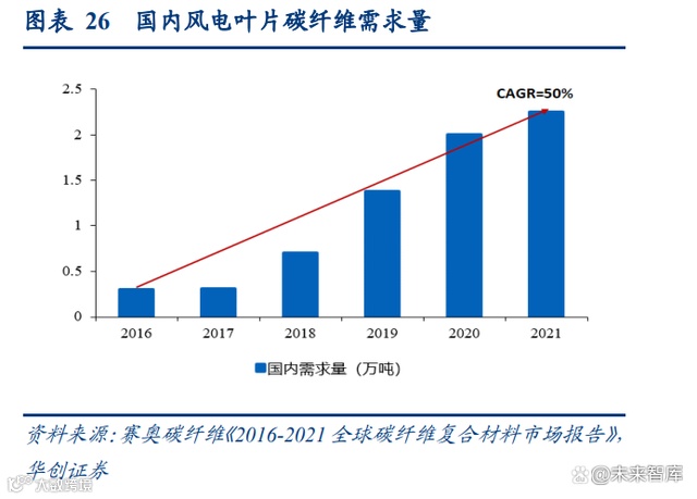 根据中国风能专委会 CWEA 统计,国内风电装机规模显著上行,2020、2021 年分别是陆 上、海上风电补贴的最后一年,抢装潮导致装机规模大幅上升,风电新增装机规模分别 是 54.43GW、55.92GW,2020 年同比增速为 103%,2021 年海上新增装机量大幅上升, 全年新增装机量依然保持正增长,2021 年国内海上风电新增装机量同比增速高达 277%。《风能北京宣言》提出,“十四五”规划要为风电设定与碳中和国家战略相适应的发展空 间,保证年均新增装机 50GW 以上,2025 年后,国内风电年均新增装机容量应不低于 60GW,到 2030 年至少达到 800GW,未来国内风电装机规模有望继续提升。随着风电装机规模的持续上行,碳纤维在风电叶片领域的需求将快速增加。根据赛奥碳 纤维《2016-2021 全球碳纤维复合材料市场报告》,全球风电叶片碳纤维需求从 2016 年的 1.8 万吨增至 2021 年的 3.3 万吨,CAGR 为 13%,2025 年预计全球风电叶片碳纤维需求量约为 8.1 万吨,2021-2025 年间的 CAGR 为 25%,碳纤维在风电叶片领域的市场空间依 然很大。