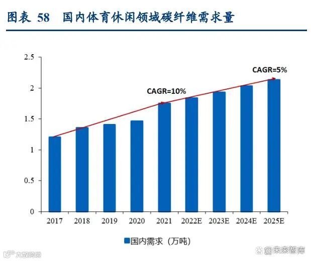 根据赛奥碳纤维《2017-2021 全球碳纤维复合材料市场报告》,全球体育休闲领域碳纤维 需求从 2017 年的 1.32 万吨增至 2021 年的 1.85 万吨,CAGR 为 9%,2025 年预计全球体育休闲领域碳纤维需求量约为 2.25 万吨,2021-2025 年间的 CAGR 为 5%。2021 年国内 体育休闲领域碳纤维需求量约为 1.75 万吨,CAGR 为 10%,同比增速为 20%,相较于 2020 年的 4%大幅增加,主要原因是 2020 年疫情的影响,群体运动的碳纤维器材有较大幅度的下滑,而 2021 年开始放开群体运动,直接带来了体育器材的较高速增长。我们预计国 内未来体育休闲领域的碳纤维需求增速和全球保持一致,CAGR 为 5%,2025 年国内体育休闲领域碳纤维需求量约为 2.13 万吨,假设碳纤维单价维持 18.7 万元/吨(按 27.6 美 元/kg,美元/人民币汇率为 6.76 换算),2025年我国体育休闲领域碳纤维市场规模将达 39.83 亿元。