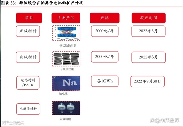 2021 年钠离子电池持续稳步发展:3 月华阳股份受让阳煤智能制造基金,投资“北京奇峰”、 “中科海钠”项目,分别涉及飞轮储能、钠离子电池业务,其中持有中科海钠 15.56%的股权;到 3 月底,由华阳股份母公司华阳新材料与中科海钠、开源资产合作建设的山西新阳清洁能源项 目第一条钠离子电池生产线试生产,该项目拟投资 2.8 亿元,建设年产圆柱钢壳钠离子电芯 4000 万只、方形铝壳钠离子电芯 400 万只的两条生产线;4 月 13 日,公司发布公告,旗下子 公司新阳能源拟投资不超过 1.4 亿元,与中科海钠成立合资公司,共建钠离子电池正负极材料 4000 吨,约 0.8Gwh 的容量,其中,正极为钠铜铁锰氧化物,负极为无烟煤软碳,而华阳股份 是国内最大的无烟煤上市公司,目前无烟煤年产能 4170 万吨;6 月,华阳股份与中科海纳共 同开发出了 1MVh 钠离子电池储能系统,已正式投运;9 月,华阳股份与多氟多、天津梧桐树 拟就六氟磷酸钠、六氟磷酸锂以及电解液添加剂、负极材料等项目展开合作;华阳股份持续挖掘钠离子电池潜能:9 月 30 日,公司发布公告,公司的全资孙公司华钠 芯能投资建设的钠离子电芯生产线设备安装调试已完成,预计建设 1GWh 钠离子电池电芯及 PACK 产线,这为钠离子电池产业高质量发展奠定了扎实基础;与中科海纳预计在 2023 年共 同扩产 2000 吨钠离子电池正负极产线。