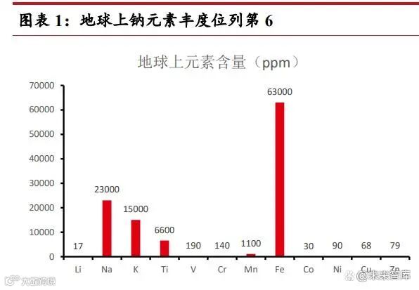 锂资源短缺,钠含量丰富优势体现。早在 20 世纪 80 年代,钠离子电池就已经被短暂研究 过,但是由于当时锂离子电池在能量密度方面更具有明显的优势,广泛应用于商业化生产中, 因此钠离子电池的研究工作被搁置了。近年来,由于锂资源短缺造成锂离子电池的成本增加, 限制了其在大规模储能设备领域的应用。因此,原料丰富且成本低廉的钠再次引起了科学家们 的兴趣。在元素周期表中,钠与锂是处于同一主族且具有相似物理化学性质的金属元素,地球上的 钠资源储量非常丰富,元素含量约为 23000ppm(锂含量仅约为 17ppm),丰度位于第 6 位, 且分布于全球各地,可完全不受资源和地域的限制。所以在资源方面,钠离子电池比锂离子电 池具有更大的优势。