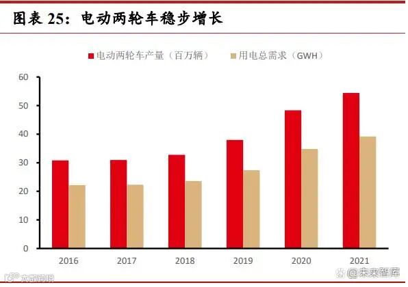 此外钠离子电池还可以广泛应用在电动两轮车、A00 级电动车以及替代铅酸电池上。(1)电动两轮车稳步增长:根据 EVTank 数据,2021 年中国电动两轮车总体产量达到 5443 万辆,同比增长 12.6%,增长幅度较 2020 年出现较大幅度的下滑。其中电动摩托车产量为 251 万辆,同比增长 21.3%,电动轻便摩托车产量为 64 万辆,同比下滑 41.6%。2021 年,锂电版 电动两轮车的产量为 1317 万辆,总体渗透率为 24.2%,带动电动两轮车用锂离子电池出货量 为 13.1GWh,同比增长 21.7%。(2)A00 级电车快速发展:根据乘联会数据显示 2021 年 A00 级细分市场销量为 89.9 万 辆,其中纯电动车型销量为 89.85 万辆,占比接近 100%。同时,在 2021 年新能源车销量榜前 15 位中,有 8 款是 A00 级纯电动车。宏光 MINI EV、奇瑞 QQ 冰淇淋、长安奔奔作为主流的 A00 纯电轿车产品之所以这些车型受到市场和消费者的认可,主要是因为有着传统车企的生 产模式和成熟体系,加上通用类配件等采购链的优势。这类主流 A00 级产品的产品定位和目标定位清晰。产品定位上,价格在 3-5 万元,且成本低、维修方便;目标定位上,聚焦中、小型城市和县乡市场的女性和中老年用户,以及家庭第 二辆车,与主流新能源车型形成了差异化的产品格局,未来仍有巨大的成长空间。