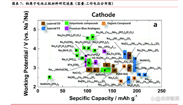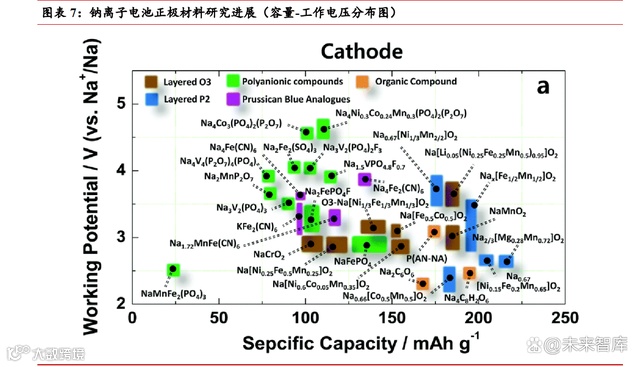 聚阴离子正极稳定性较强,但成本较高。聚阴离子型正极材料拥有坚固且开放的三维框 架,材料的结构稳定性与热稳定性非常高,因此聚阴离子型正极材料具有更好的循环稳定性与 安全性能。类似 LiFePO4,NaFePO4 电化学性能较为优异,但 NaFePO4能量密度较低。另一类 被广泛研究是以 Na3V2(PO4)3 为代表的 NASICON 结构材料,其具有高度开放的框架结构,可 以为钠离子提供了三维扩散通道和很大的迁移间隙,具有出色的倍率性能。目前磷酸钒钠已经 有小批量量产,但成本较高。