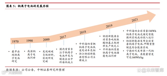 硬碳负极的研发,钠电池逐渐走向成熟。1970 年到 1980 年间,整个钠电行业处于研发阶 段,开始出现高温硫钠电池以及 NaMeO2 正极;1980 到 1990 年,开始将钠电应用到动力和储 能方面,发明了高温钠离子电池,但此时缺乏稳定的负极;1990 到 2000 年,储能应用研发逐 渐减少,钠电研发进程放缓,转而钠-氯化镍电池开始发展;从 2000 年发现硬碳负极材料开始, 整个钠电行业实现了研发突破。国内钠电池进展迅速,已经进入商业化前夕。2010 年,中科院开始发现钠离子电池,成 为国内最早涉及该领域的组织机构;2017 年,国内首家专注于钠离子电池开发与制造的企业 中科海纳成立;2018 年,中科海纳首辆钠离子电池低速电动车亮相,同年,浙江钠创新能源 有限公司注册成立;2019 年,钠创新能源全球首条吨级铁酸钠基正极材料生产线完工,同年, 中科海纳首座钠离子电池储能电站问世;2021 年,中科海纳全球套 1MWh 钠离子电池光储充 智能微网系统成功投入运行,同时期,钠创新能源发布全球首套钠离子电池-甲醇重整制氢综合能源系统,而且宁德时代发布第一代钠离子电池,其能量密度可达 160Wh/kg。