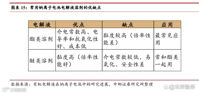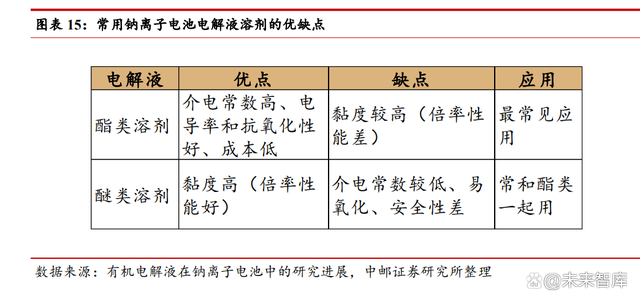 (2)醚类电解液可以提升电池的能量密度,但稳定性较差。醚类电解液的成分主要为 DME(乙二醇二甲醚)和 DOL(二氧五环)等,醚类电解液可以促进钠离子在炭材料层间的 插入,有助于提升材料的比容量、首效和倍率性能。但是醚类电解液容易生成过氧化物,耐氧 化性差,应用时容易起火,安全性差。