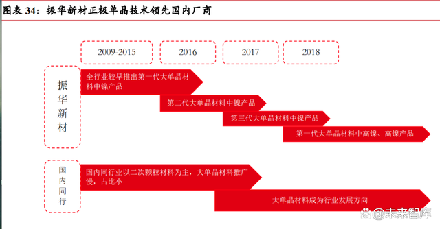 振华新材专注于正极材料的研发。公司于 2004 年成立,自成立以来专注于锂离子电池正 极材料的研发、生产及销售,主要提供新能源汽车、消费电子及储能领域产品所用的锂离子电 池正极材料,包括中镍、中高镍、高镍、超高镍在内的多种型号一次颗粒大单晶镍钴锰酸锂三 元正极材料(NCM)。公司前瞻性布局层状氧化物路线的钠离子电池正极材料:目前已向主要客户送样和小批 量出货,截止 2022 年 6 月 30 日,公司已具备钠离子电池正极材料的产业化条件。公司钠离子 电池正极材料是层状氧化物路线,目前已经升级为第二代产品,已向客户送样,同时也部分小 规模产出并销售。第二大产品相较于第一代,在克容量、首效、碱度控制上均有改善提升。振华新材正极单晶技术领先国内厂商。公司于 2009 年推出第一代 NCM523 单晶三元产 品,后续又于 2016 年、2017 年分别推出第二、第三代 NCM523 单晶三元产品,在继承高安全 性和循环稳定性的基础上提升比容量,降低内阻。2018 年公司推出 NCM613 单晶产品,2019 年推出 NCM811 单晶产品,成为国内较早具备高镍一次颗粒大单晶三元正极材料批量生产、 销售的正极材料企业之一。相较国内同行业竞争对手具备显著领先优势。
