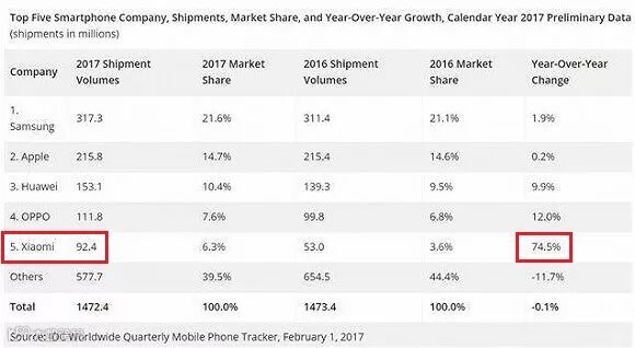 2017年手机销售成绩的大逆袭, 全年9240万支逼近1亿支大关。在全球市场同比-0.1%的大环境下, 全年同比成长高达74.5%,不仅2017年整年度排名进入全球前5。
