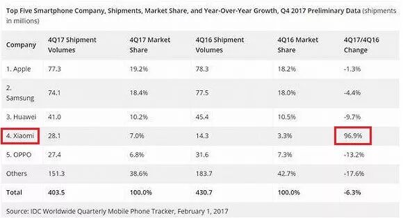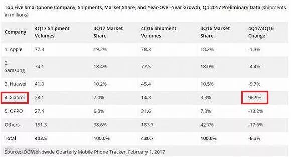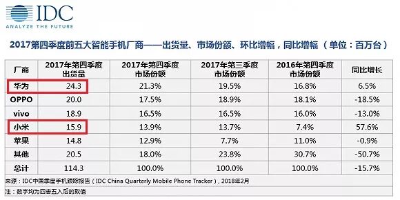 4季度除了是全球第4,并且还是全球前5名手机业者中,唯一同比正成长的公司, 同比成长更高达96.9%,