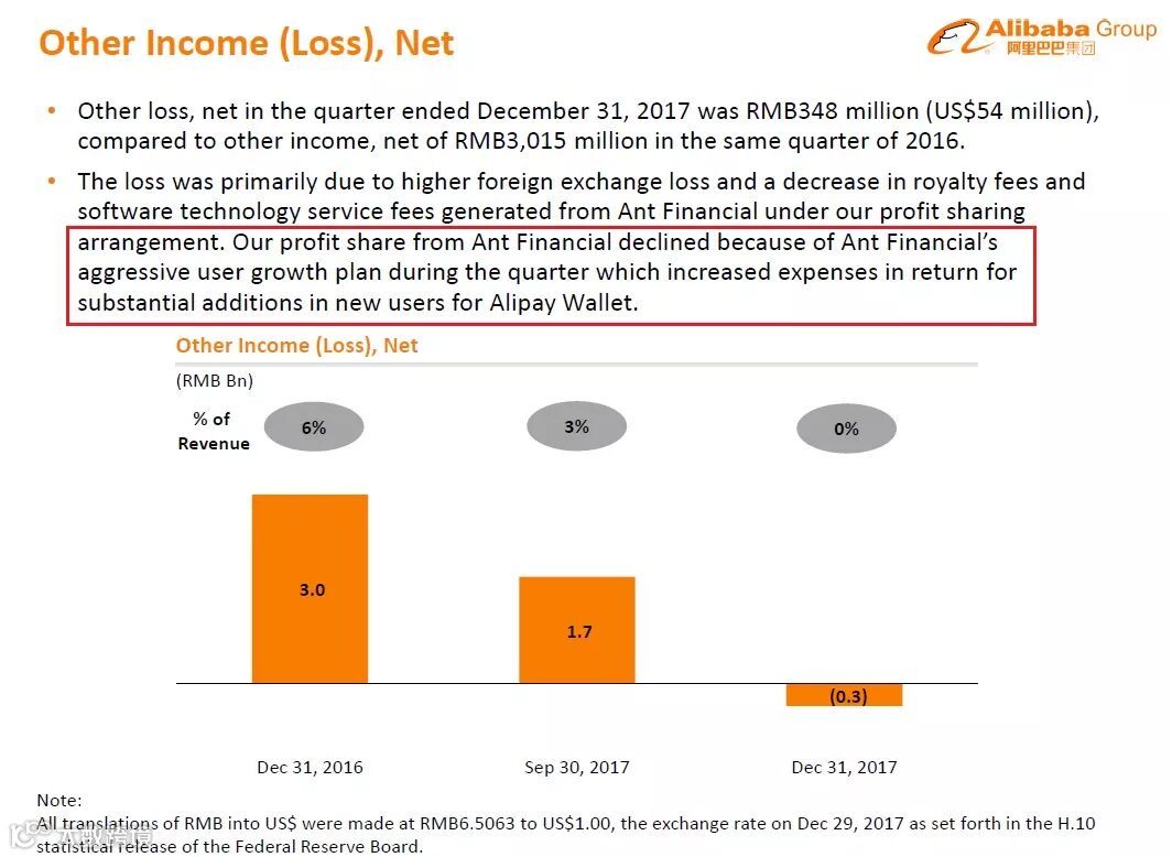 而且,由阿里巴巴财报资料可以看到,在蚂蚁金服利润分成减少的说明中,蚂蚁金服正在进行积极的支付宝新用户增长计划。我们研判这可能是Alipay支付宝下一阶段规模跃进的信号。