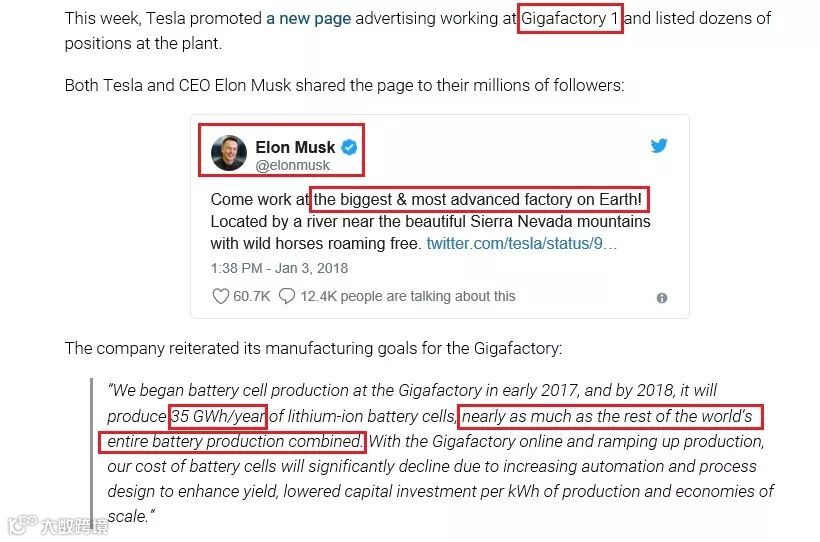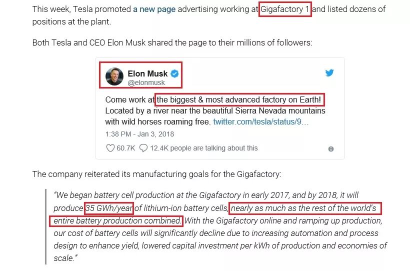 我们还是拿宁德时代来举例说明,再看1次Tesla CEO 马斯克的说法,Tesla的Gigafactory 1所订的35GWh年产能," nearly as much as the rest of the world’s entire battery production combined. "( " 相当于全球其他电池产能的总和 ")。
