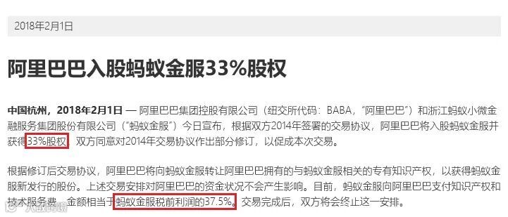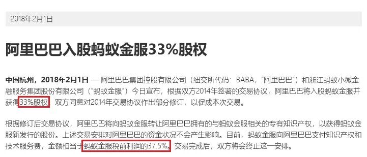 根据2014年8月阿里巴巴在招股书当中披露的协议,蚂蚁金服每年需向阿里巴巴支付知识产权及技术服务费,金额相当于蚂蚁金服税前利润的37.5%。