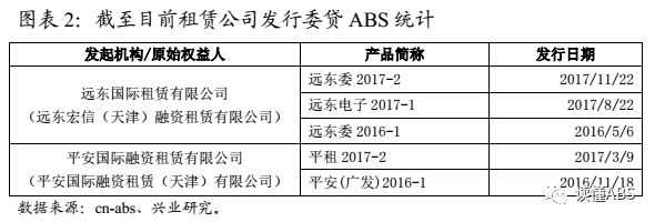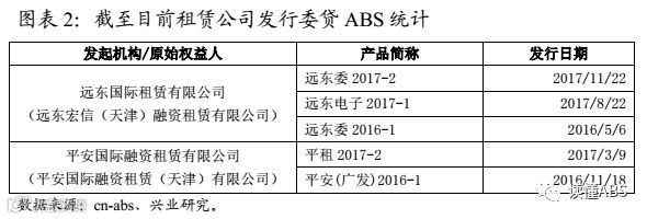 存量委托贷款 ABS 主要是租赁公司作为原委托贷款债权人和原始权益人发行的产品,该委托贷款是基于其常规业务而形成的一笔存量债权资产,将其转让至专项计划发行的 ABS 产品。其资金来源一般是租赁公司的外部融资,以银行信贷资金为主,委贷新规对这一结构影响大。 但截止目前仅远东租赁和平安租赁分别发行了 3 单,并非是主流产品类型,委托贷款亦不是租赁公司的主要业务,因此委贷新规影响不大。