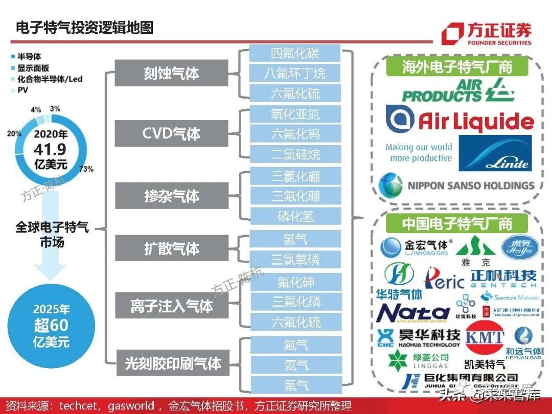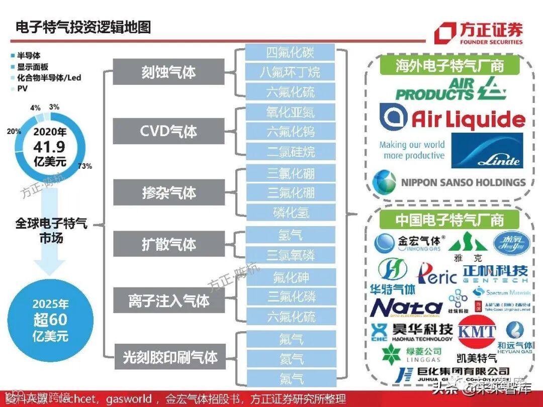 电子特气,即电子特种气体,是大规模集成电路、平面显示器件、化合物半导体器件、太阳能电 池、光纤等电子工业生产中不可或缺的基础和支撑性材料之一。电子特气在工业气体中属于附加 值较高的品种,与传统工业气体的区别在于纯度更高(如高纯气体)或者具有特殊用途(如参与 化学反应)。