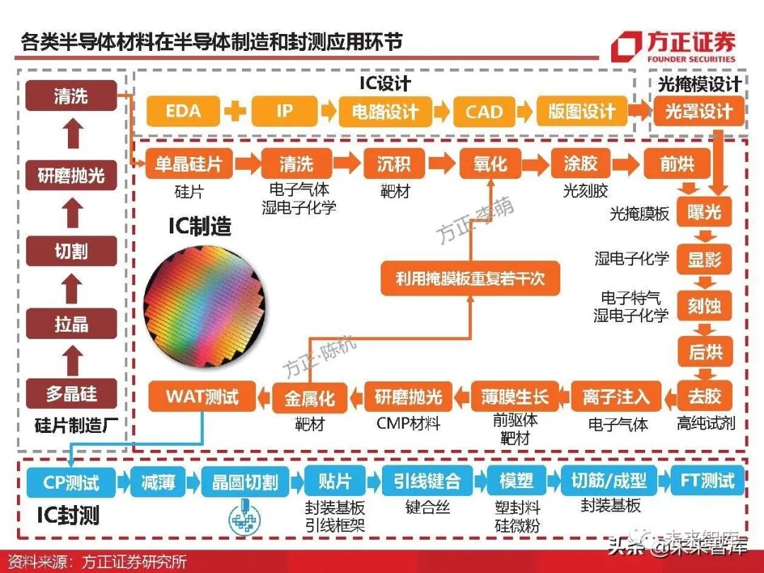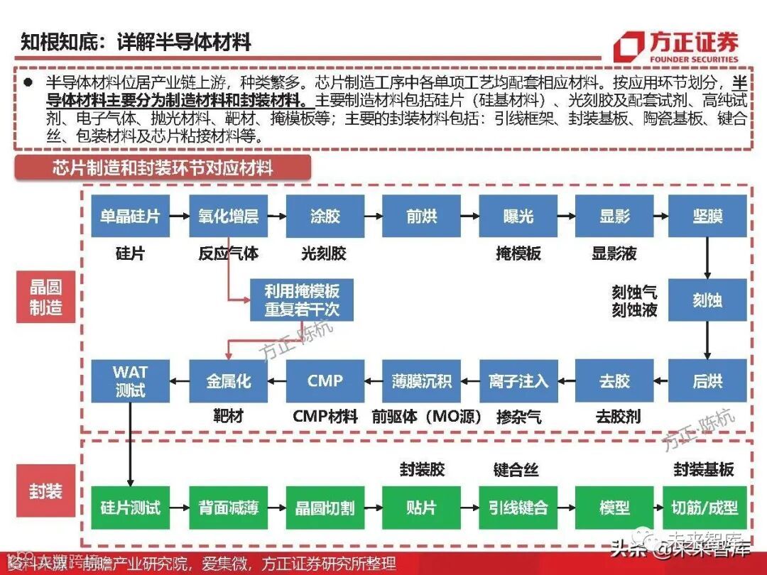 半导体材料是一类具备半导体性能(导电能力介于导体与绝缘体之间,电阻率约在1mΩ·cm~1GΩ·cm范围 内),一般情况下导电率随温度的升高而提高。半导体材料具有热敏性、光敏性、掺杂性等特点,是用于晶 圆制造和后道封装的重要材料,被广泛应用于汽车、照明、家用电器、消费电子、信息通讯等领域的集成电 路或各类半导体器件中。