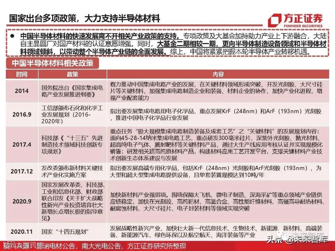 中国半导体材料的快速发展离不开相关产业政策的支持。专项政策及大基金加持助力产业上下游融合,大陆 自主晶圆厂对国产材料的认证意愿增强。同时,大基金二期相较一期,更向半导体制造设备领域和半导体材 料领域倾斜,以带动整个半导体产业链的全面发展。综上,中国将紧紧把握本轮半导体产业转移机遇。