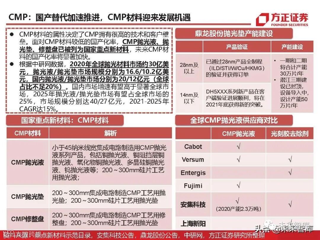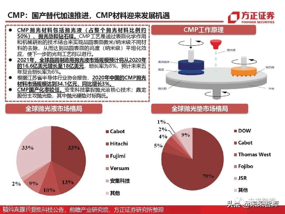 CMP 抛 光 材 料 包 括 抛 光 液 ( 占 整 个 抛 光 材 料 比 例 约 50%)、抛光垫和钻石碟。CMP工艺是通过表面化学作用 和机械研磨的技术结合来实现晶圆表面微米/纳米级不同材 料的去除,从而达到晶圆表面的高度(纳米级)平坦化效 应,使下一步的光刻工艺得以进行。