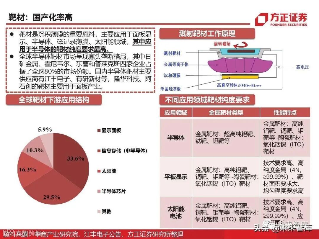 依据2020年全球半导体制造材料349亿美元规模和靶材3%左右占比计算,2020年全球靶材市 场规模10.5亿美元左右。根据techcet数据,2020-2024年全球靶材市场年复合增速5%,预 计2024年全球溅射靶材市场12.8亿美元左右。