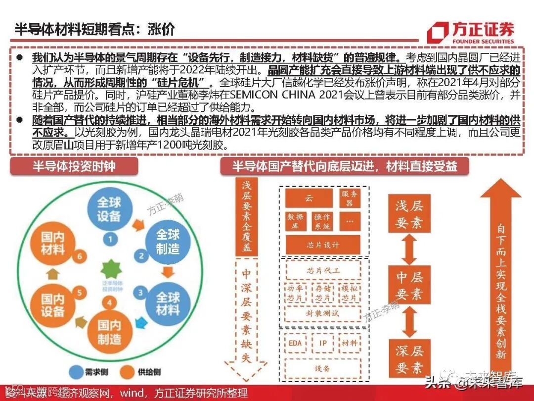 我们认为半导体的景气周期存在“设备先行,制造接力,材料缺货”的普遍规律。考虑到国内晶圆厂已经进 入扩产环节,而且新增产能将于2022年陆续开出。晶圆产能扩充会直接导致上游材料端出现了供不应求的 情况,从而形成周期性的“硅片危机”。全球硅片大厂信越化学已经发布涨价声明,称在2021年4月对部分 硅片产品提价。同时,沪硅产业董秘李炜在SEMICON CHINA 2021会议上曾表示目前有部分品类涨价,并 非全部,而公司硅片的订单已经超过了供给能力。