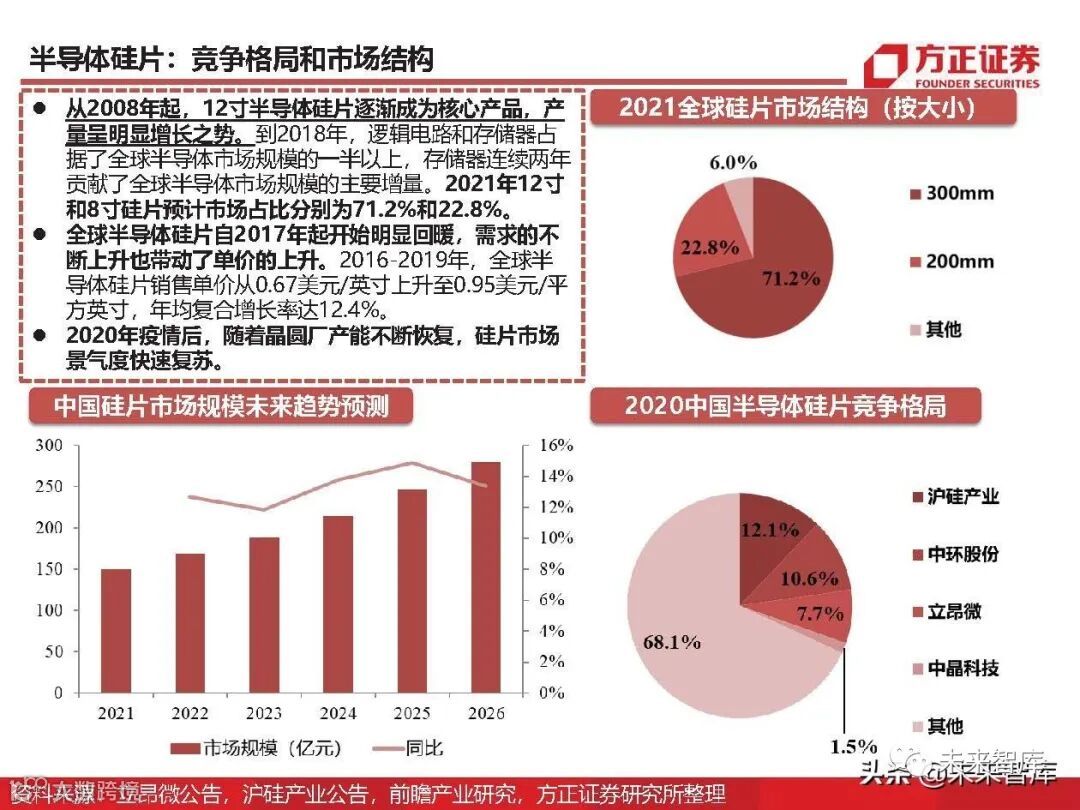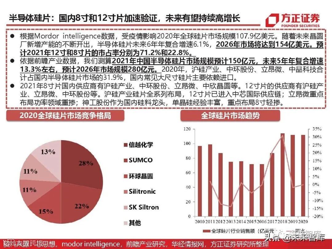 根据Mordor intelligence数据,受疫情影响2020年全球硅片市场规模107.9亿美元。随着未来晶圆 厂新增产能的不断开出,半导体硅片未来6年年复合增速6.1%,2026年市场将达到154亿美元。预 计2021年12寸和8寸片的市占率分别为71.2%和22.8%。