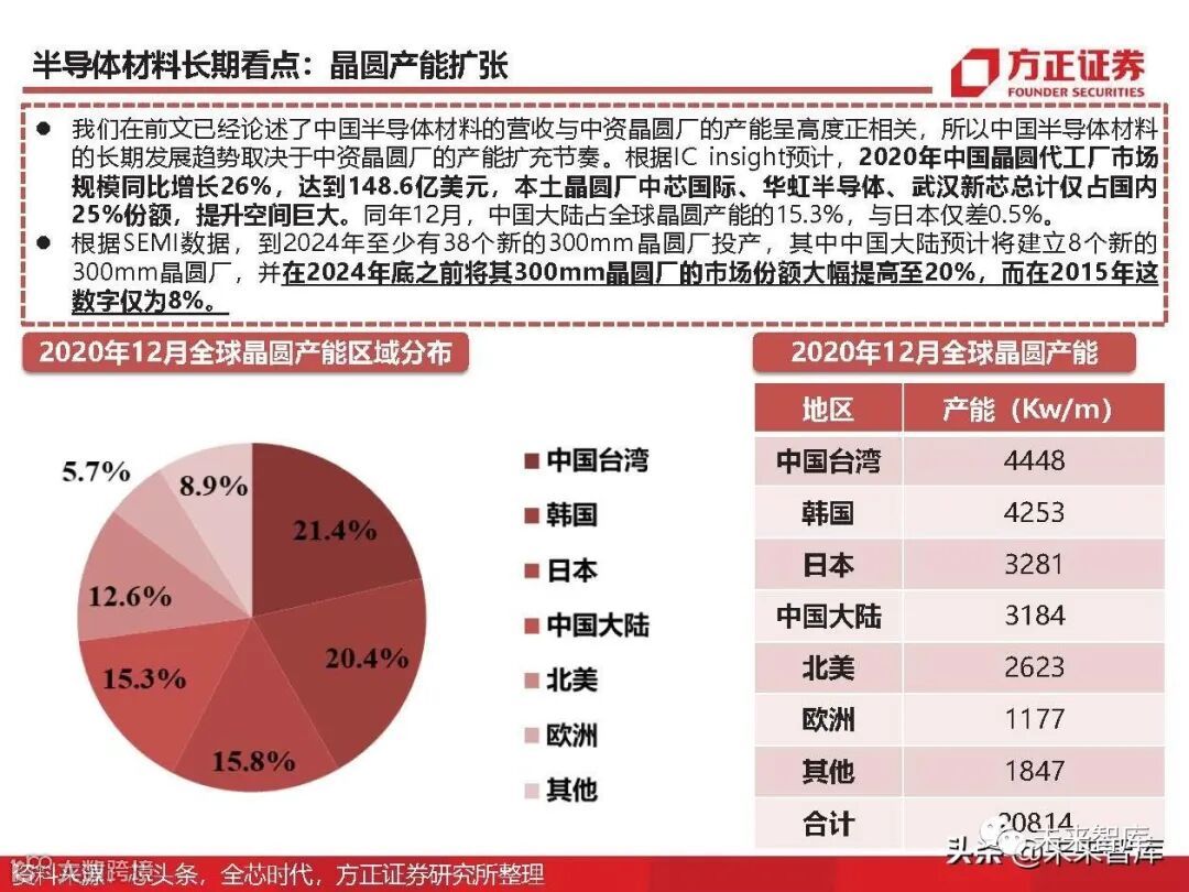 我们在前文已经论述了中国半导体材料的营收与中资晶圆厂的产能呈高度正相关,所以中国半导体材料 的长期发展趋势取决于中资晶圆厂的产能扩充节奏。根据IC insight预计,2020年中国晶圆代工厂市场 规模同比增长26%,达到148.6亿美元,本土晶圆厂中芯国际、华虹半导体、武汉新芯总计仅占国内 25%份额,提升空间巨大。同年12月,中国大陆占全球晶圆产能的15.3%,与日本仅差0.5%。