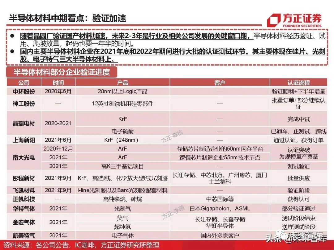 一般而言,半导体材料下游认证壁垒高,客户粘性大。客户认证壁垒是国内半导体材料发展受 阻的主要因素,企业短期实现壁垒突破存在一定困难,部分企业会通过进行并购快速切入相关 半导体材料领域。目前能够完全突破壁垒的企业很少,大部分材料细分领域被日韩及欧美地区 企业所把持。