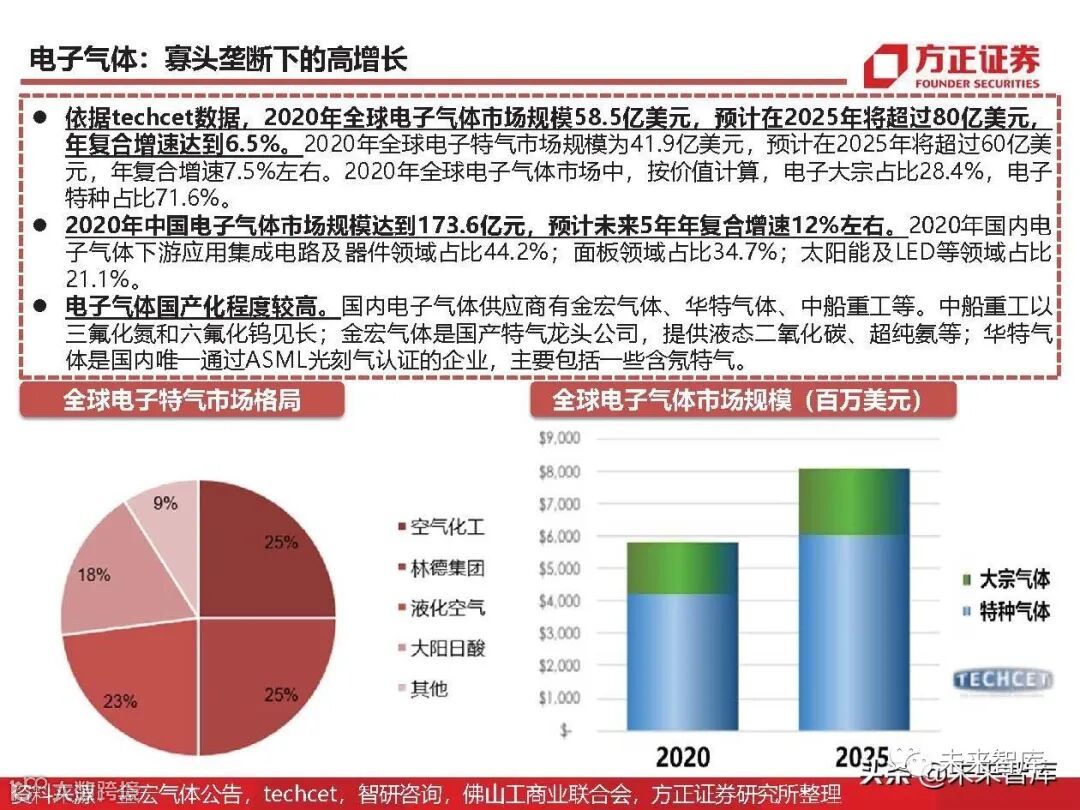 依据techcet数据,2020年全球电子气体市场规模58.5亿美元,预计在2025年将超过80亿美元, 年复合增速达到6.5%。2020年全球电子特气市场规模为41.9亿美元,预计在2025年将超过60亿美 元,年复合增速7.5%左右。2020年全球电子气体市场中,按价值计算,电子大宗占比28.4%,电子 特种占比71.6%。
