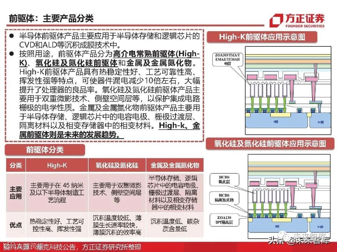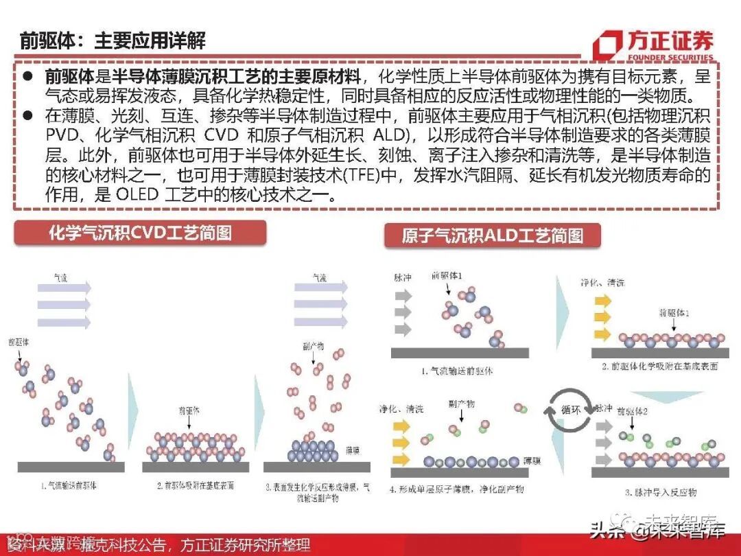 前驱体是半导体薄膜沉积工艺的主要原材料,化学性质上半导体前驱体为携有目标元素,呈 气态或易挥发液态,具备化学热稳定性,同时具备相应的反应活性或物理性能的一类物质。