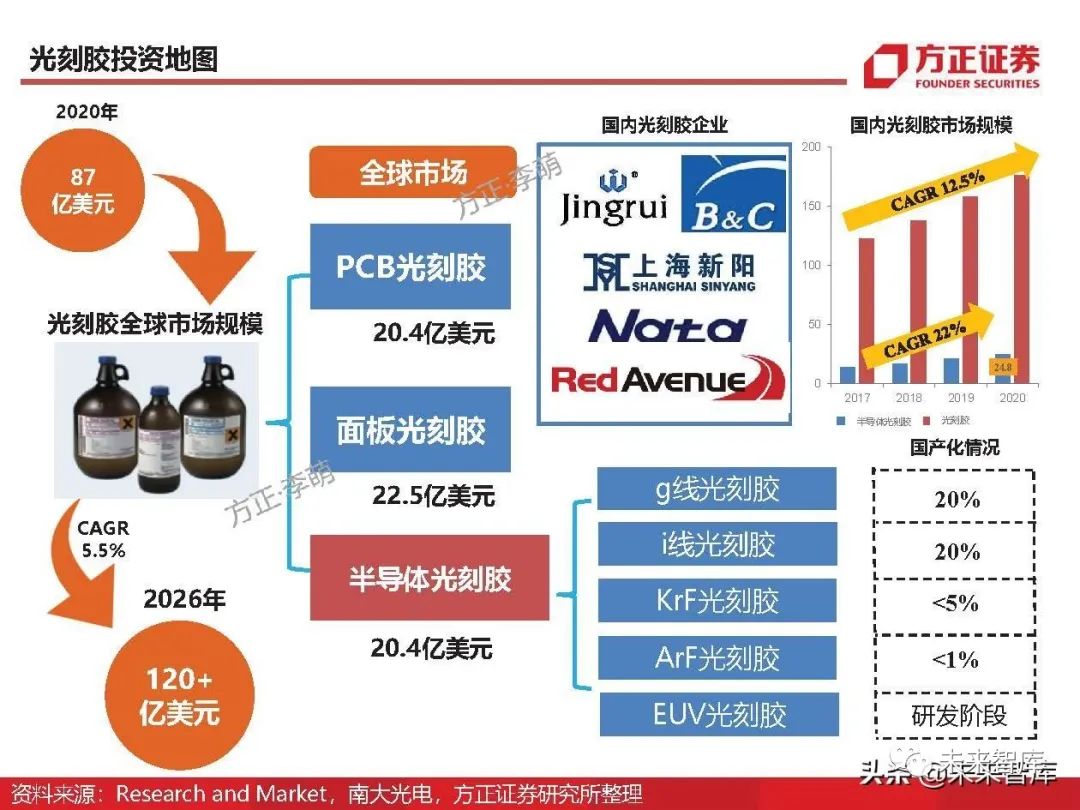 分类及三大下游应用:光刻胶经过几十年不断的发展和进步,应用领域不断扩大,衍生出非常多的种类,根据应用领域, 光刻胶可分为半导体光刻胶、平板显示光刻胶和PCB光刻胶,其技术壁垒依次降低。相应地,PCB 光刻胶是目前国产替代进度最快的,LCD光刻胶替代进度相对较快,半导体光刻胶目前国产技术较 国外先进技术差距最大。