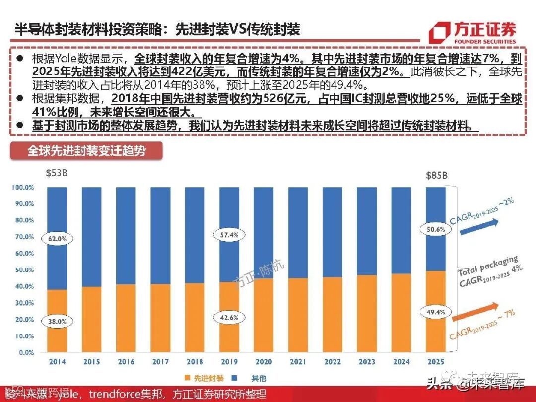先进封装VS传统封装:根据Yole数据显示,全球封装收入的年复合增速为4%。其中先进封装市场的年复合增速达7%,到 2025年先进封装收入将达到422亿美元,而传统封装的年复合增速仅为2%。此消彼长之下,全球先 进封装的收入占比将从2014年的38%,预计上涨至2025年的49.4%。