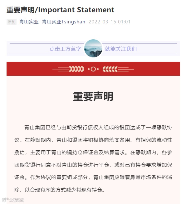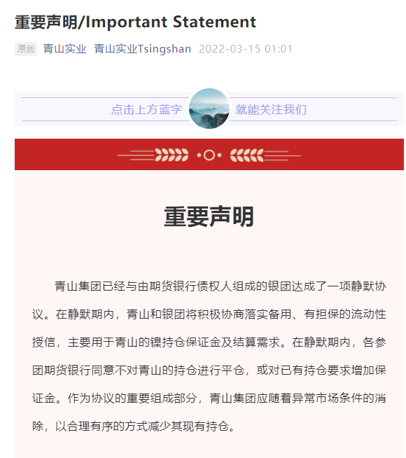 北京时间3月15日凌晨,“青山实业”微信公众号发布了一则《重要声明》,声明提出,青山集团已经与由期货银行债权人组成的银团达成了一项静默协议。在静默期内,青山和银团将积极协商落实备用、有担保的流动性授信,主要用于青山的镍持仓保证金及结算需求。在静默期内,各参团期货银行同意不对青山的持仓进行平仓,或对已有持仓要求增加保证金。作为协议的重要组成部分,青山集团应随着异常市场条件的消除,以合理有序的方式减少其现有持仓。