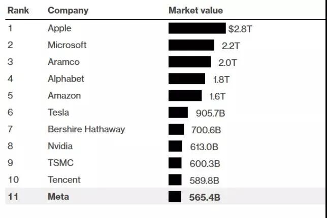 按照市值排名,Meta公司曾是全球第六大公司,估值超过1万亿美元。但这家公司遭遇史上最严重的月度股价跌幅的打击,2月17日单日跌幅则超过4%。根据彭博社汇编的数据,Meta当天以5650亿美元的估值收盘,市值排名跌至全球第11位,被腾讯控股有限公司超越。(环球时报)