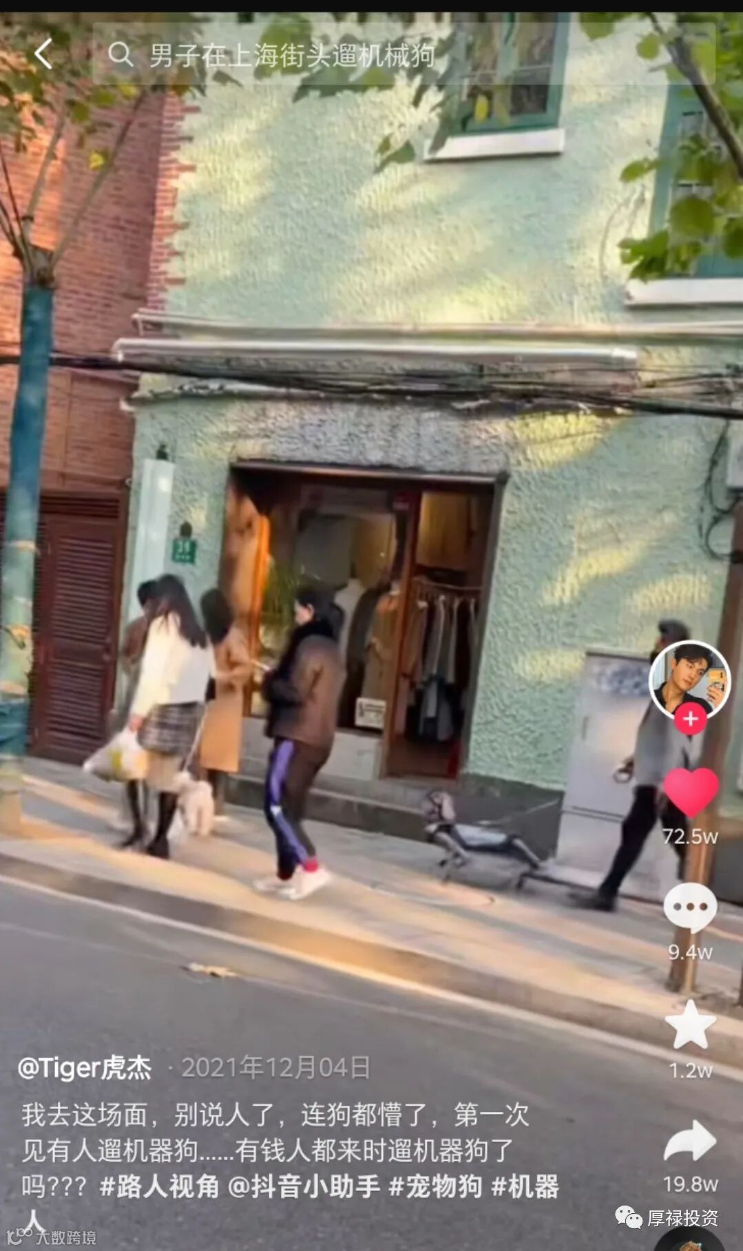 王京京同时也是科技账号“无魂胜有魂”的所有者,去年4月参加大厂活动拍摄到机械狗与真狗相遇的场面,在抖音播放超100万次。“以前工程师都觉得机械狗很昂贵,不会用它来逗狗,我也是比较赶巧,完全是意外拍摄。”