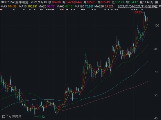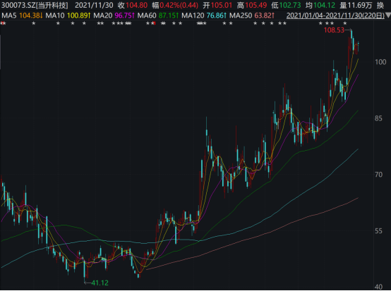 今年乘着新能源车的东风,当升科技的股价表现也是可圈可点,从今年3月下旬一路震荡上扬,截至11月30日收盘,当升科技报收104.80元/股,年内涨幅翻倍,高达104.80%;最新总市值为475亿元。