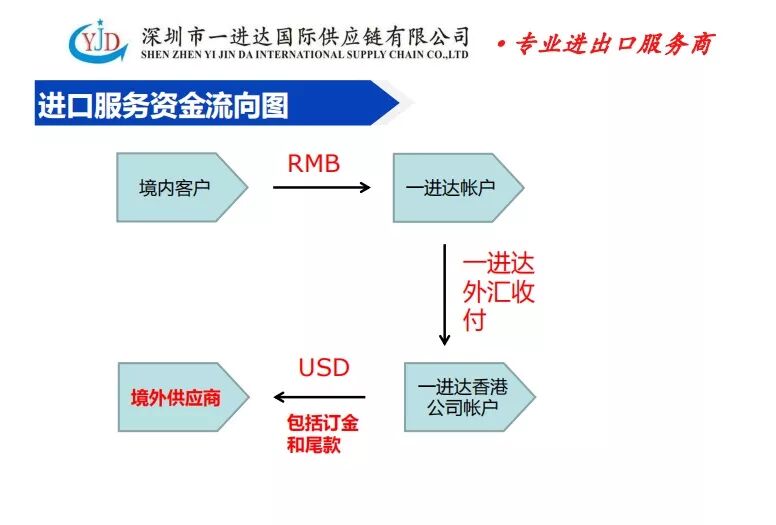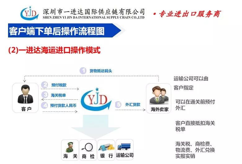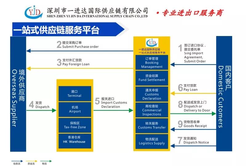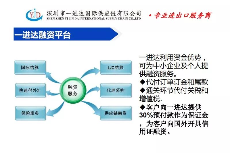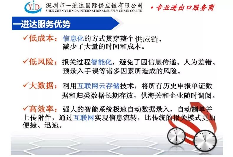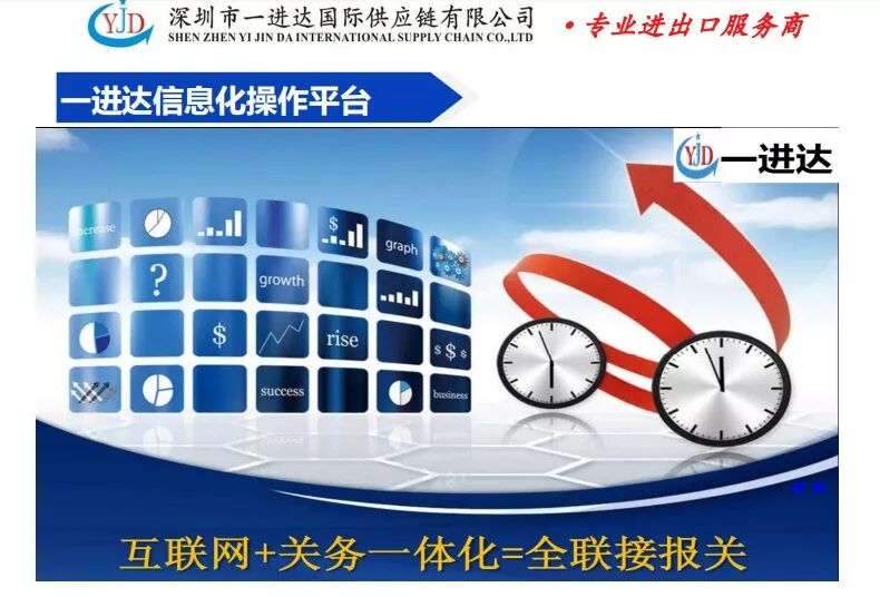 深圳市一进达国际供应链有限公司是一家经由深圳市工商行政管理局批准成立的专业进出口服务公司,是深圳报关协会和深圳市检验检疫协会会员单位,一站式为大中小型企业和个人提供进口报关、出口报关、全国单证服务及国际采购、贸易融资、外汇收付、物流配送等一条龙优质服务。本公司拥有一支技术过硬、专业熟练的人才队伍,始终秉承着“诚信经营,共同发展”经营思路,秉持“科学管理,以人为本,安全快捷,贴心服务”的质量方针,规范经营、认真负责、恪守信用,是广大客户优选的专业进出口服务商。