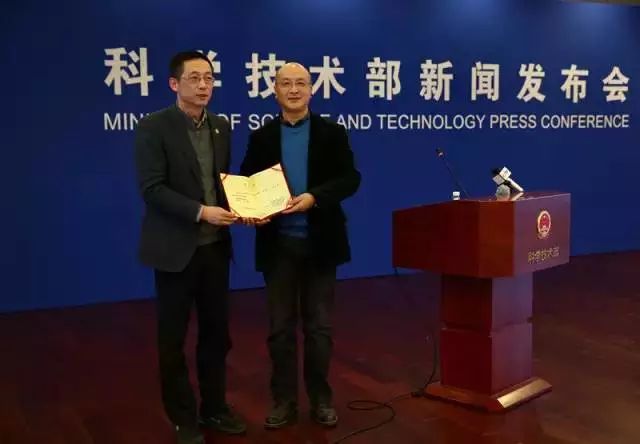 2月20日,在2016年度中国科学十大进展发布会现场,中科院许瑞明研究员(右)向获奖代表施一公院士颁发证书。新华社记者 金立旺 摄
