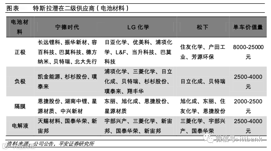 同时,电池环节中的正极、负极、隔膜、电解液、结构件等电池材料二级供应商也有较高的单车配套价值和壁垒。