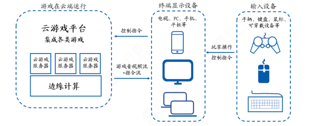 具体过程为玩家在云端服务器上拥有一台虚拟电脑,云端的游戏画面与声音通过网络传输至手机、电脑、平板等终端显示设备,玩家通过手柄、鼠标、键盘等输入设备实时控制位于云端的虚拟电脑进行游戏。