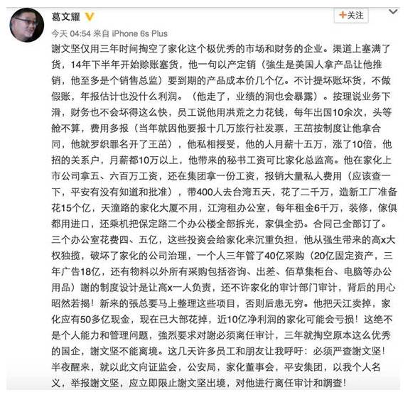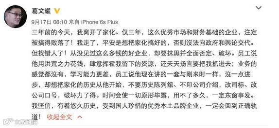 而这并非是葛文耀首次公开叫板代表资方的管理层。翻查之前的微博可以看到,虽已离退,葛文耀一直在观察着家化和谢文坚,多次在微博大段陈述有关上海家化和谢文坚存在的问题。9月17日,他在微博上表示,自己离开的三年,“这么优秀市场和财务基础的企业,注定被搞得败落了!”,自己“没法向政府和舆论交代”,还指出平安“找错了人”。